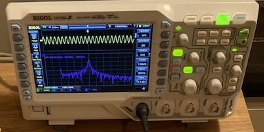 I have already enabled FFT transformation (this varies between scope models, refer to your scope’s manual for information on how to do this). We can see that the amplitude of the signal is around 0.2V, while the most significant frequency component is located around 1kHz. The signal looks nice and sharp, especially considering how little work and money we have put into this.